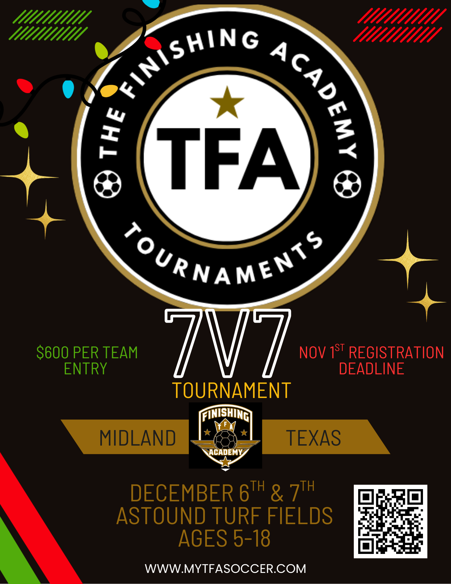 TFA hosts six to eight small-sided tournaments each year. TFA believes a key component to development is on the pitch playing the game. TFA offers fast-paced and exciting tournaments between Midland and Odessa! Each tournament focuses on touches and technical abilities. Formatted in either 3v3, 5v5, or 7v7 style tournaments.